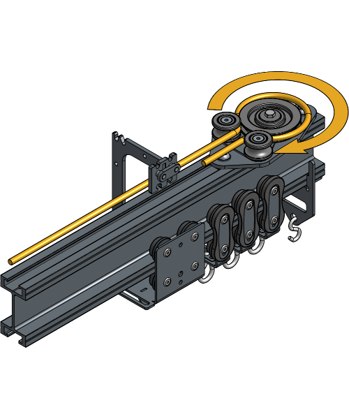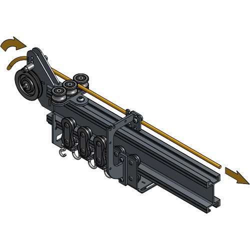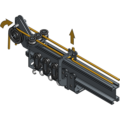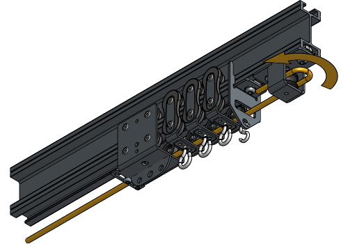 Guide the rope back through all Curve Rope Guides. End at the Carrier of which the Rope Clamp is located at this side of the track.