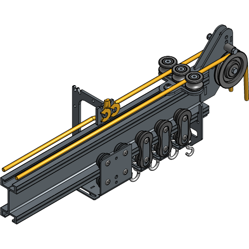 Guide the second rope end through the front side of the Head Pulley and all Curve Rope Guides and stop at the same Carrier where the first rope end is clamped.
