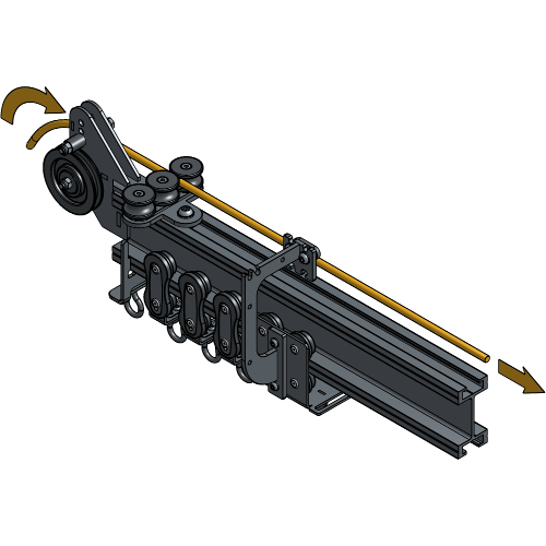 Loosen the Channel nut of the Curve Rope Guides until it fits inside the track profile and insert one every 3 m at each side of the track. Make sure they are oriented for the Master Carriers to be able to pass.