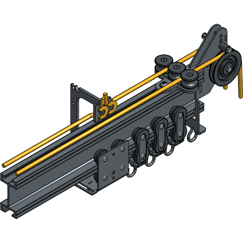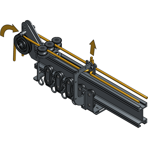 Guide the second rope end through the front side of the Head Pulley and all Curve Rope Guides and stop at the same Carrier.