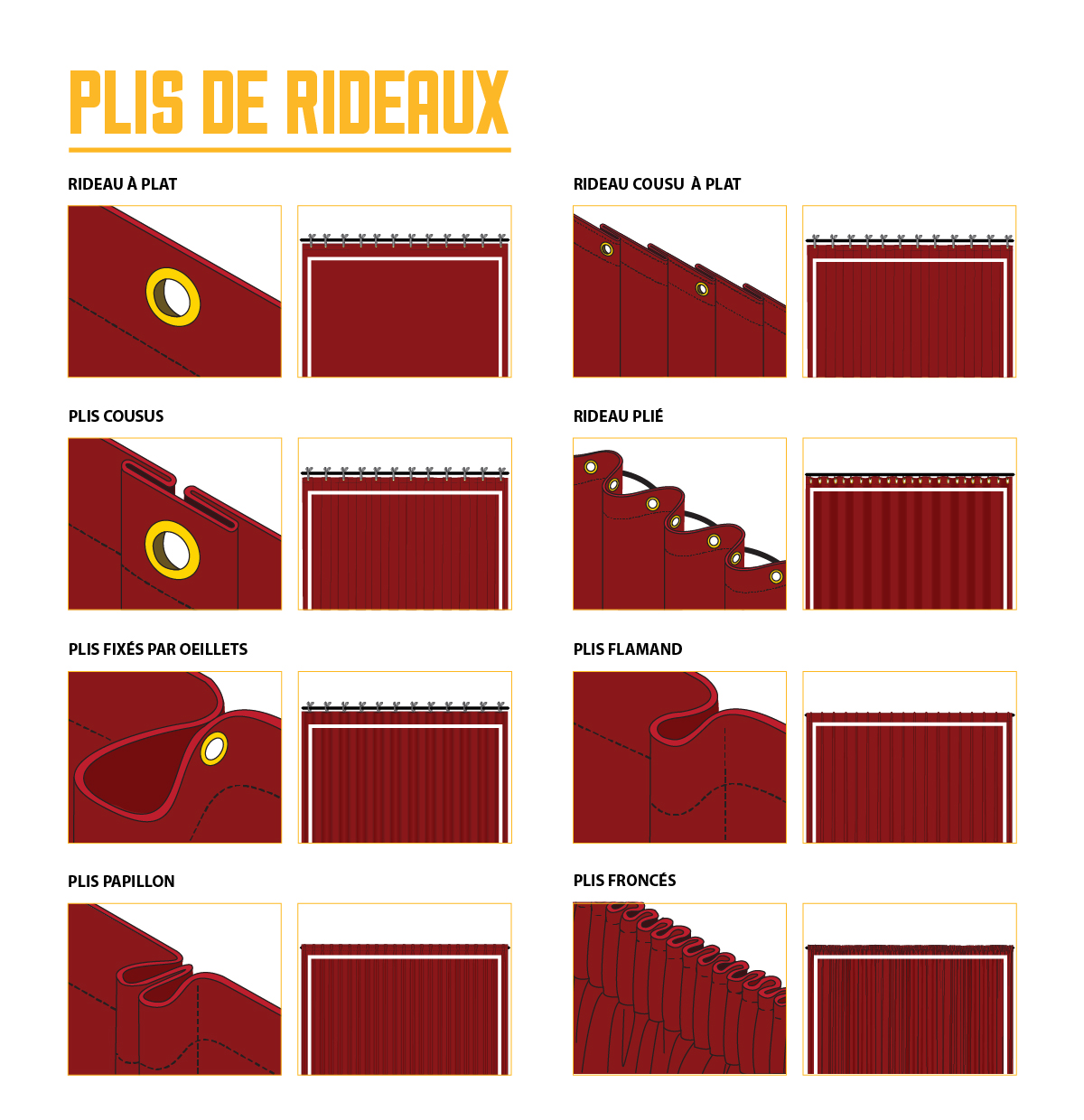 Les rideaux peuvent être confectionnés à plat ou plissés. Les plis leur donnent du relief et leur confèrent plus de profondeur ainsi qu’une meilleure absorption acoustique.